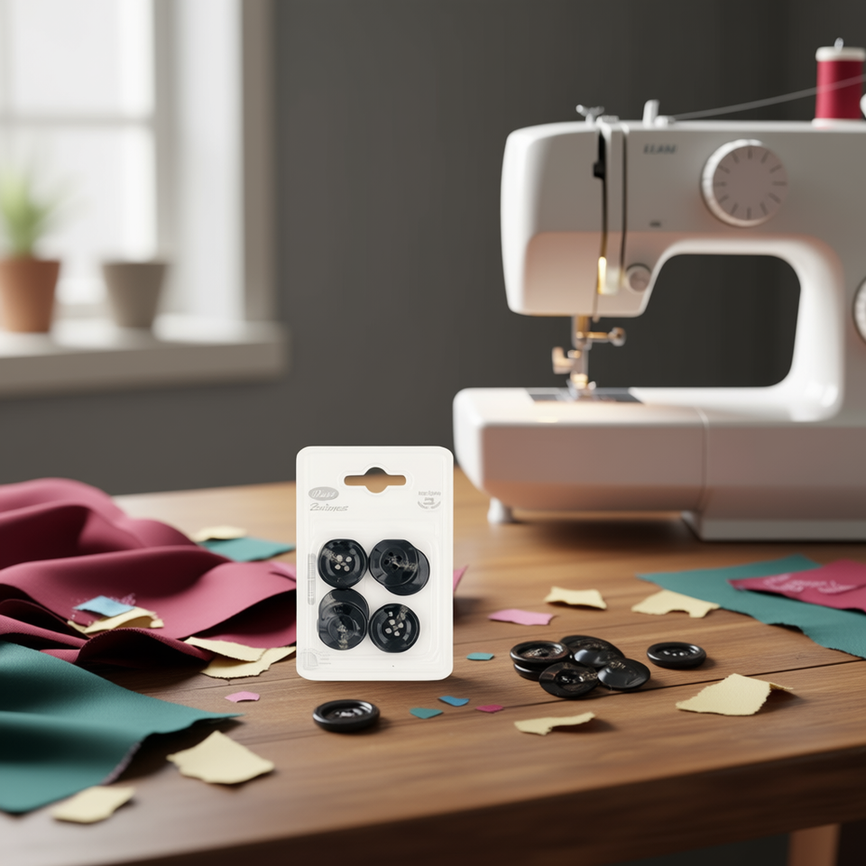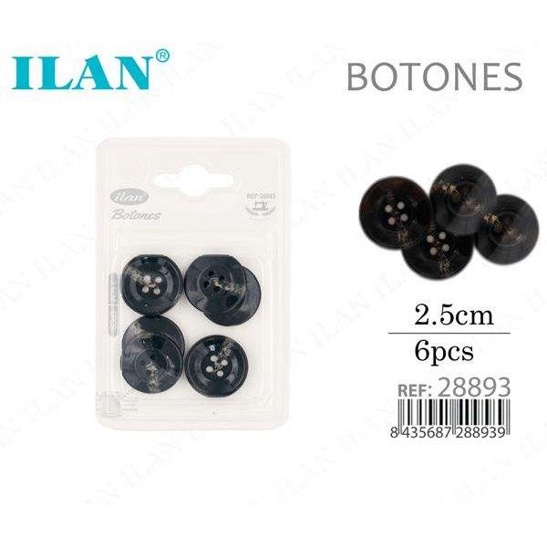 Botones Ilan de 2.5 cm, 6 Piezas, Negros, Redondos, con Cuatro Agujeros para Ropa