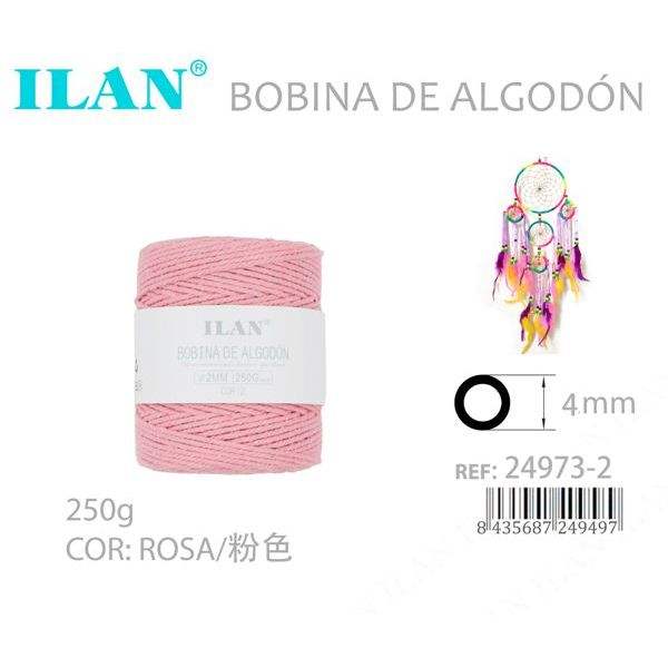 Cuerda de algodón Ilan en carrete de 4 mm, color rosa, 250 g, para manualidades