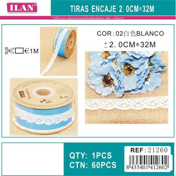 Tiras de Encaje Ilan de 2.0 cm x 32 m, Blancas, para Manualidades y Costura
