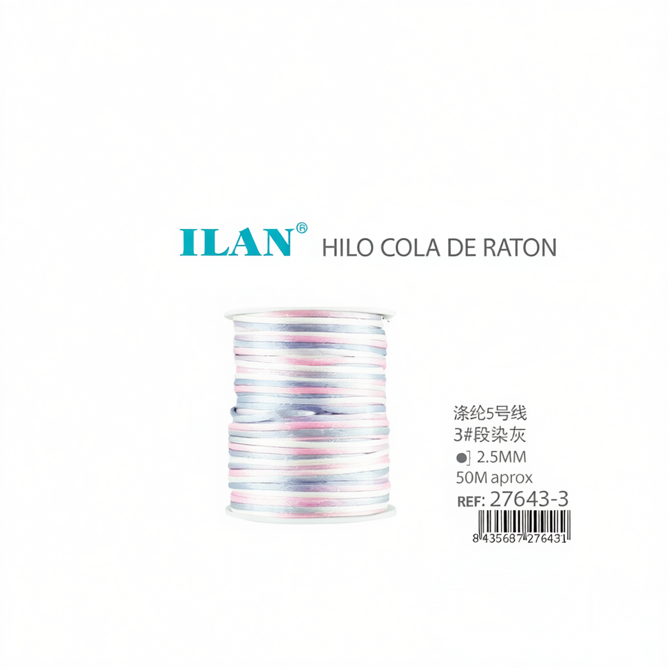 Cordón de cola de ratón Ilan de 2,5 mm, 50 m, teñido por secciones en gris, rosa y blanco, para manualidades y fabricación de joyas
