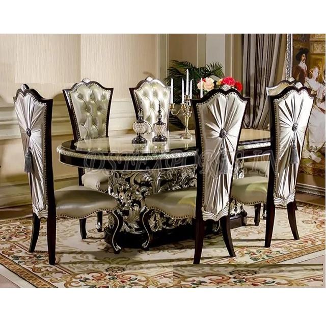 Mesa de comedor Europea tallada a mano, muebles de comedor tallados en plata tradicional, negro real