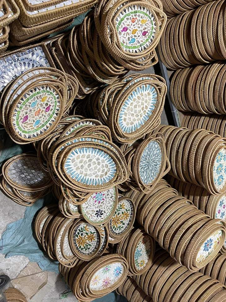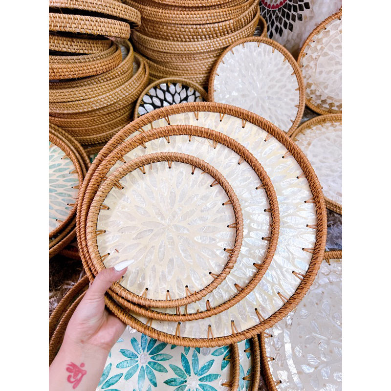 En cantidad a granel 2024 decoración bandeja de ratán mosaico tejido a mano redondo madre de perla bandeja de ratán con incrustaciones de Loto Azul Vietnam