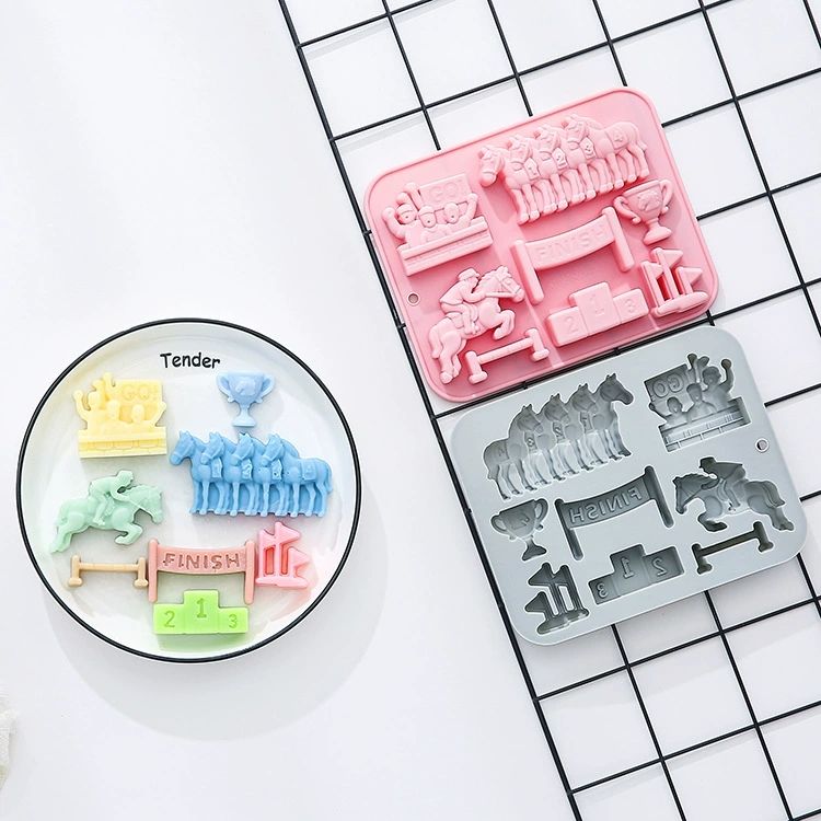 Molde de silicona de 8 cavidades con temática de carreras de caballos en stock para pasteles de chocolate, cubitos de hielo, gelatinas y caramelos. Molde de silicona para carreras de caballos.