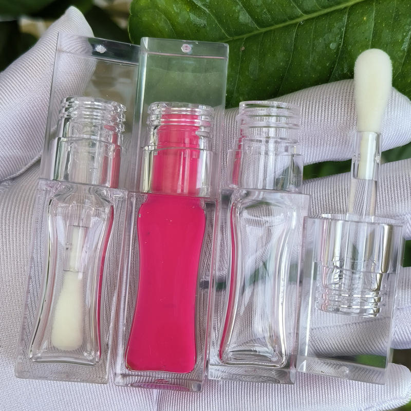 En stock: Tubos vacíos cuadrados de PETG para brillo labial, transparentes, fabricados por inyección/soplado, con mango grueso y cabezal de cepillo grande.