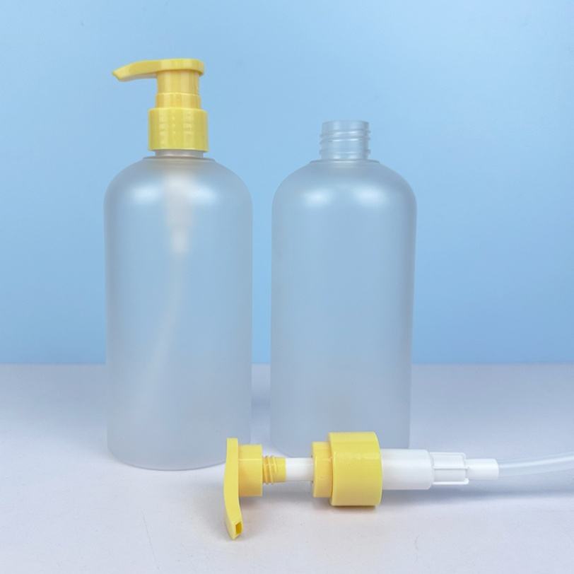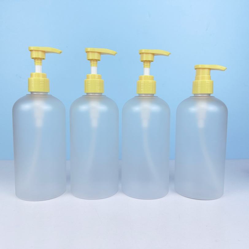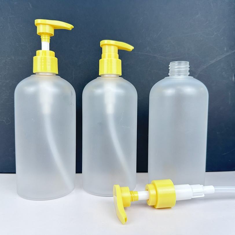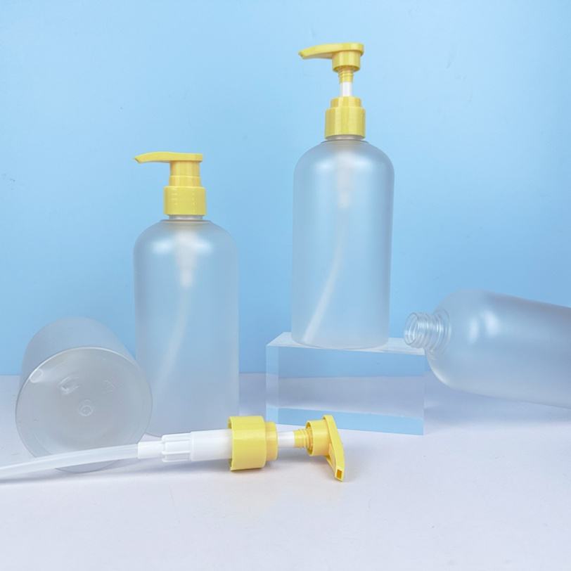 En Stock: Botella Redonda Transparente Mate de PET de 400 ml para Loción y Champú con Tapa Amarilla y Bomba Dosificadora para Sérum y Spray