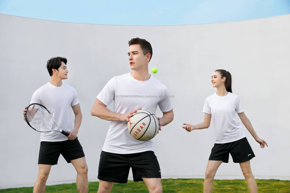 En stock Camiseta de poliéster de cuello redondo transpirable deportiva de secado rápido