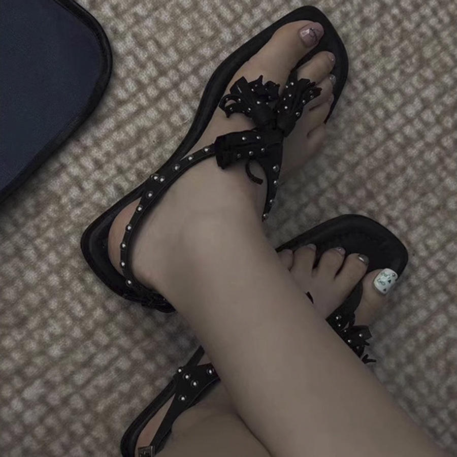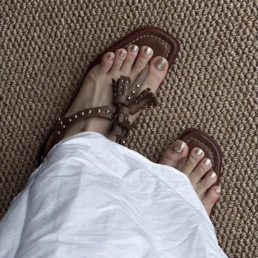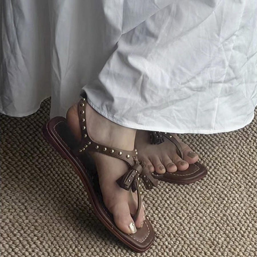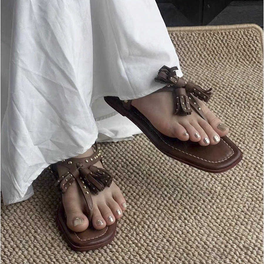 Sandalias Romanas Planas con Borlas y Remaches, Estilo Retro, para Mujer, Elegantes y Versátiles, con Punta Cuadrada, Disponibles en Stock