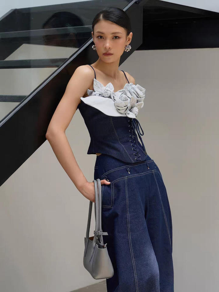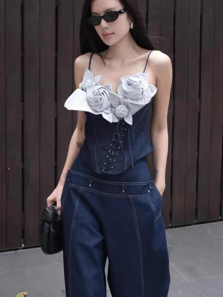 Conjunto de Dos Piezas para Mujer, Camisola Floral 3D de Diseño Vietnamita y Pantalones de Mezclilla, en Existencia