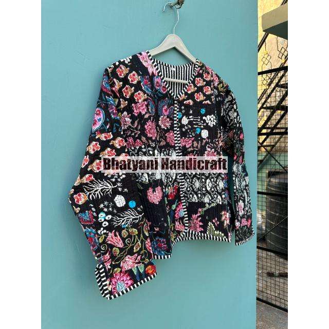Chaqueta Corta Acolchada Hecha a Mano de Algodón Indio con Estampado Floral Negro para Niñas, Chaqueta Reversible Estilo Bohemio, Chaqueta de Invierno Cálida de Manga Larga