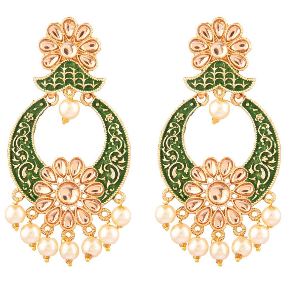 Conjunto de pendientes indios Crystal Faux Pearl Floral Chandbali Pendientes colgantes de esmalte para mujer, Verde