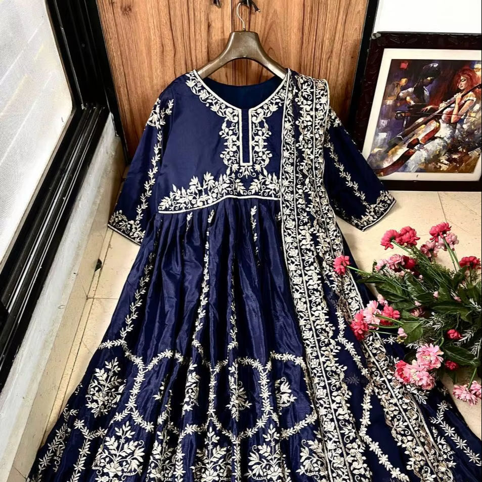 Ropa étnica india Nueva colección de diseñador Chinon Seda Hermosa pesada Bordado Vestido de trabajo con Dupatta Listo para usar Vestido
