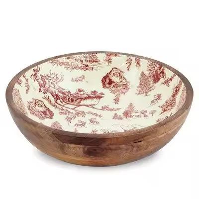 Tazón de Madera de Mango con Diseño Decorativo Personalizado Hecho a Mano en India, con Estampado de Esmalte, para Servir Frutas y Ensaladas, con Patrón Redondo para Fiestas