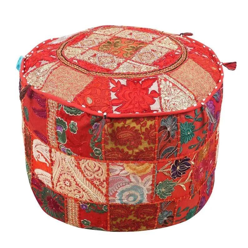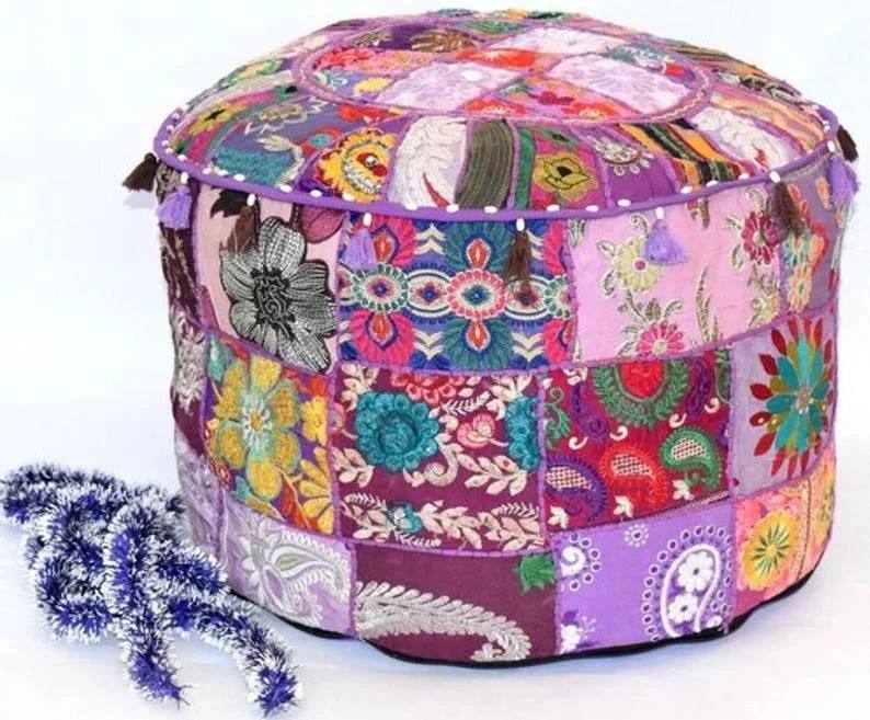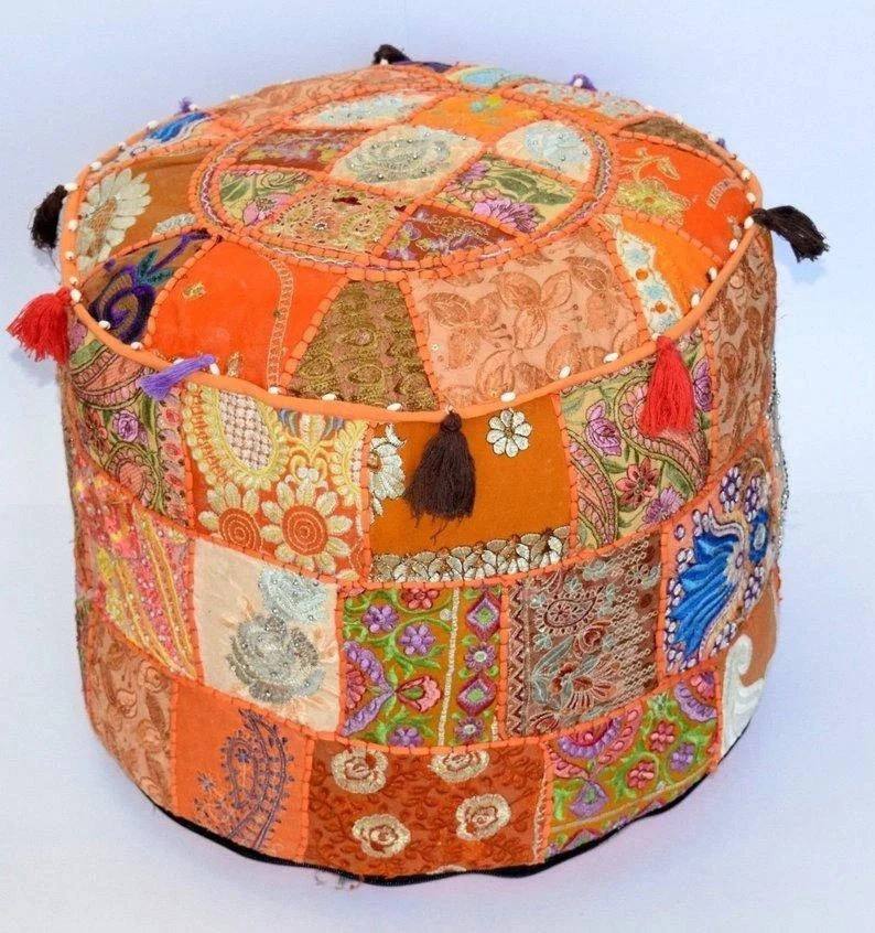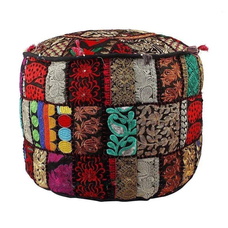 Puf Otomano Tradicional Plegable Bordado a Mano en India, Decoración Boho Bohemia Vintage, Patchwork de Algodón Reciclado para Hotel