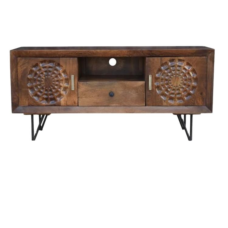 Soporte de TV de madera maciza hecho a mano indio, caja de almacenamiento de unidad de medios de madera con acabado blanco envejecido para muebles de hogar y sala de estar
