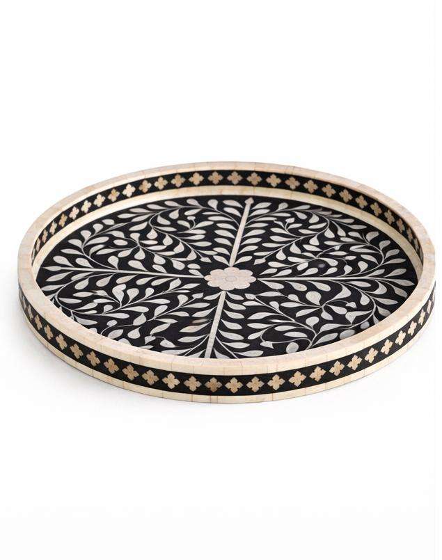 Bandeja Redonda de Lujo Tradicional Ecológica de MDF y Resina con Incrustaciones de Hueso, Diseño Floral Blanco y Negro, Calidad de Exportación, Proveedor de Artesanía India