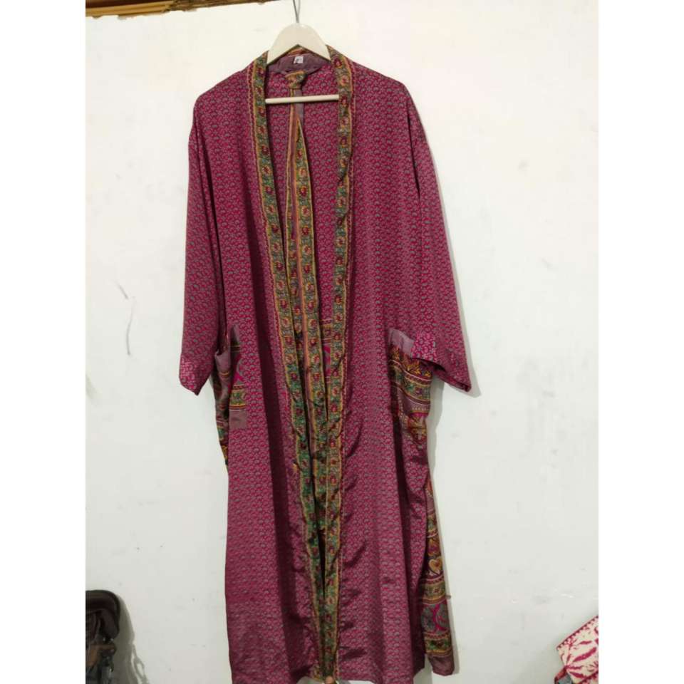 Bata de Invierno Kimono de Seda 100% Hecha a Mano en India, Cuello en V, Cierre con Cordón, Larga, Mangas Largas, Suave, Estilo Vintage, para Playa o Fiesta