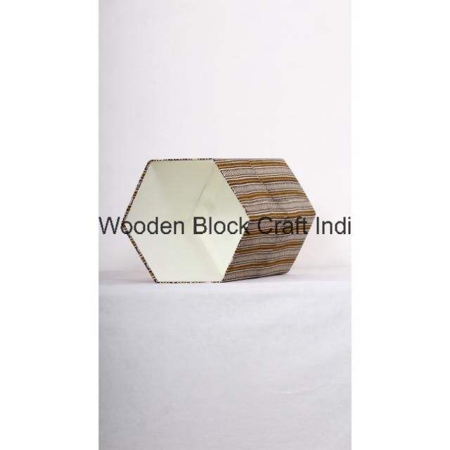 Cubo de basura decorativo de madera con diseño geométrico hexagonal, hecho a mano en Rajasthan, India, con tapa enrollable y parte superior abierta, ecológico.