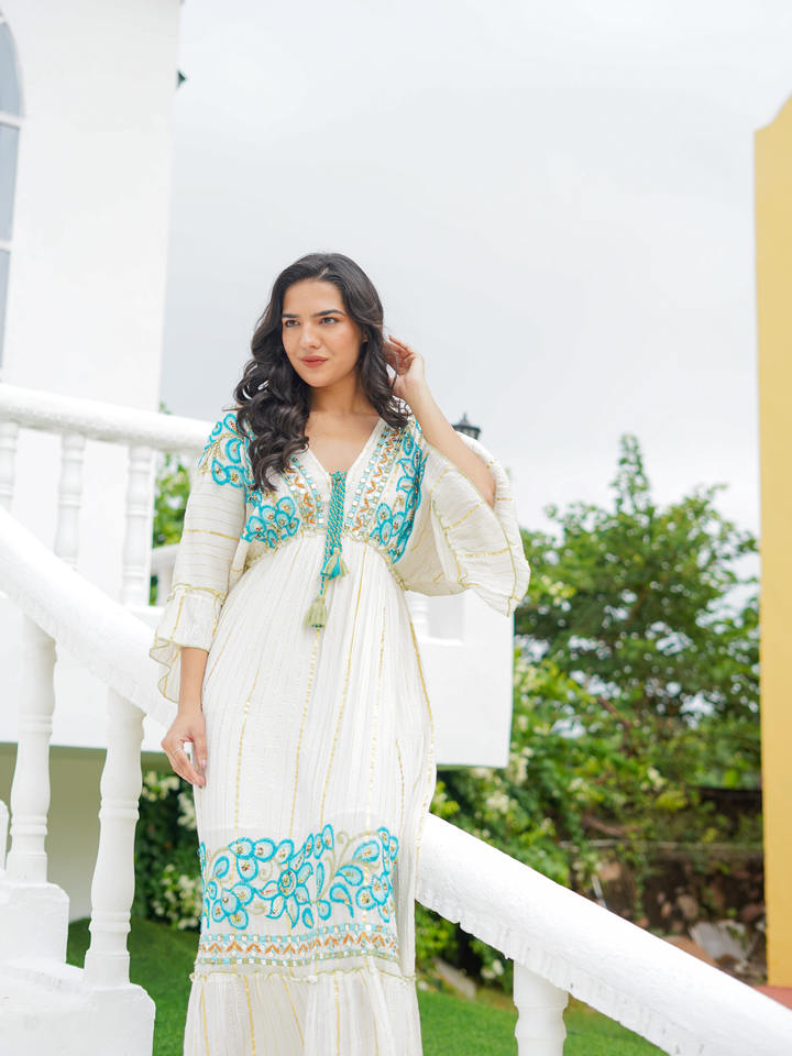 Vestido Midi de Encaje Blanco Hecho a Mano en India, Estampado Floral Digital Boho, Ligero, Estilo A-Line, Ideal para Bodas y Vacaciones de Verano