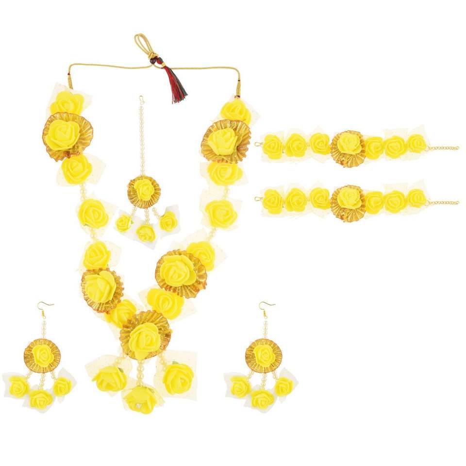 Fabricantes de joyería India nupcial Faux Pearl Floral collar pendiente Mang Tikka conjunto de joyería, amarillo