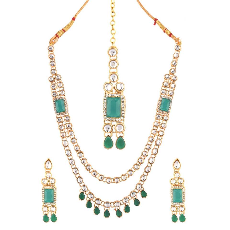 Fabricantes de joyería india, cristal chapado en oro Kundan, collar de hebra multicapa, conjunto de joyería para mujer, Verde