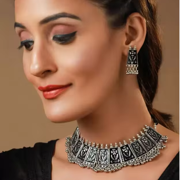 Fabricante indio, diseñador, estilo elegante, hermosa gargantilla oxidada, conjunto de collar de plata, collar de fiesta Meenakari negro