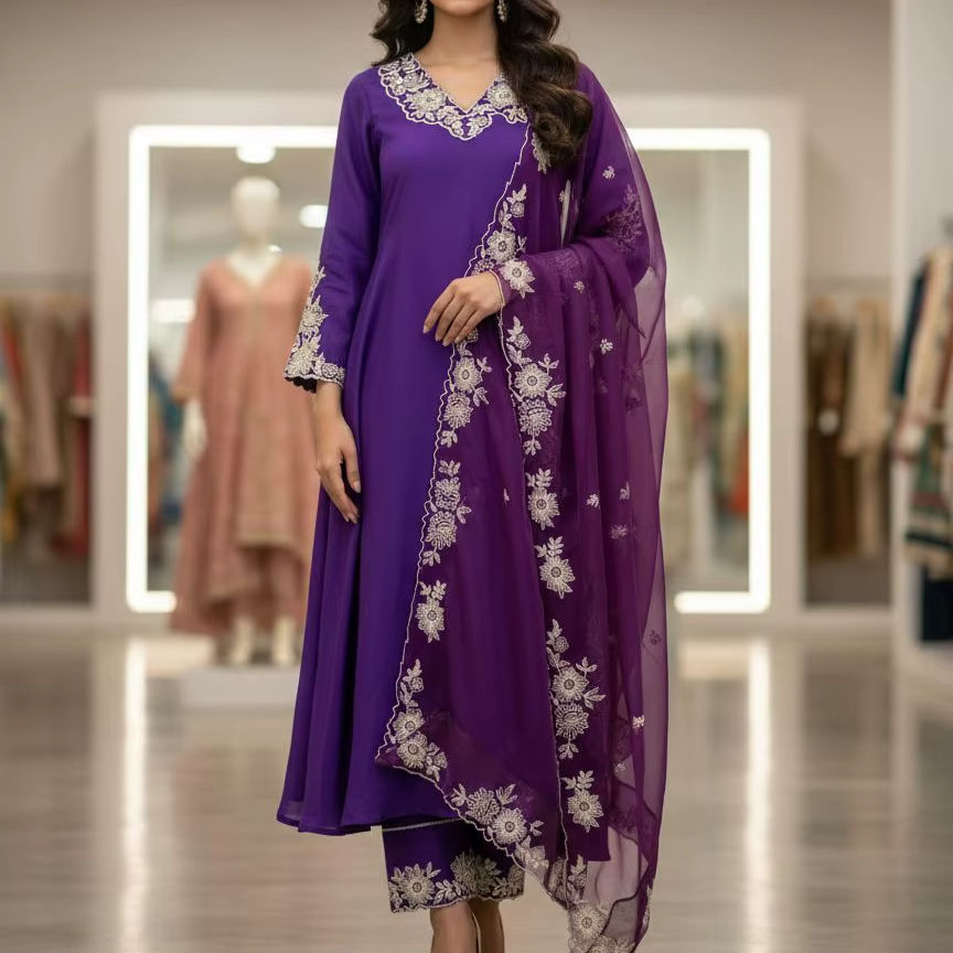 Hermoso Diseño Indio Pakistaní, Anarkali de Tela de Seda Romana, Bordado Elegante, Ropa Tradicional Informal para Mujer, para Fiestas y Bodas