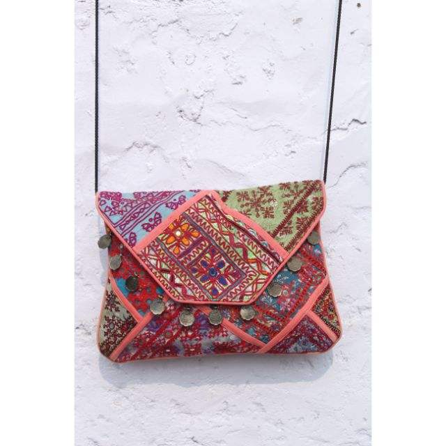 Bolso de mano indio Rajasthani hecho a mano con bordados, estilo casual Banjara, cierre abierto, cadenas, patchwork y espejos, para la noche.