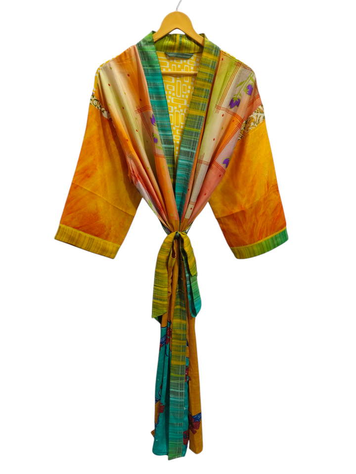 Túnica India Floral Seda Sari Kimono Vintage Sari Robe Suave Playa Fiesta Vestido Indio Hecho A Mano Seda Kimono
