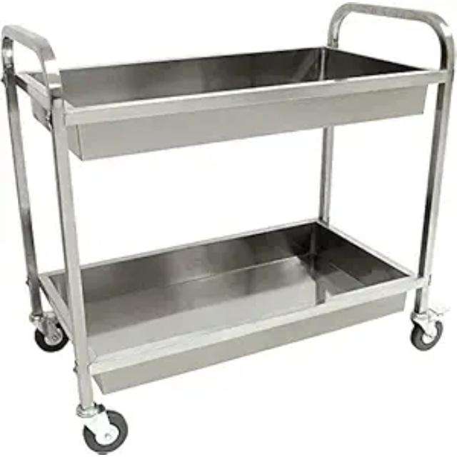 Carrito de acero inoxidable de alta carga de proveedor indio con diseño de estante de dos niveles resistente a los arañazos y ruedas de freno para uso médico