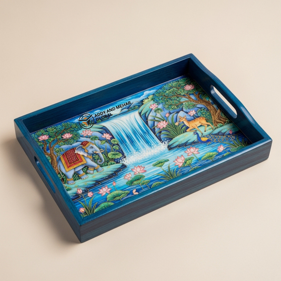 Bandeja de Madera Meena para Servir, Diseño de Elefante Grabado, Rectangular Azul, Decorativa, Biodegradable, Proveedor Indio, Venta al por Mayor