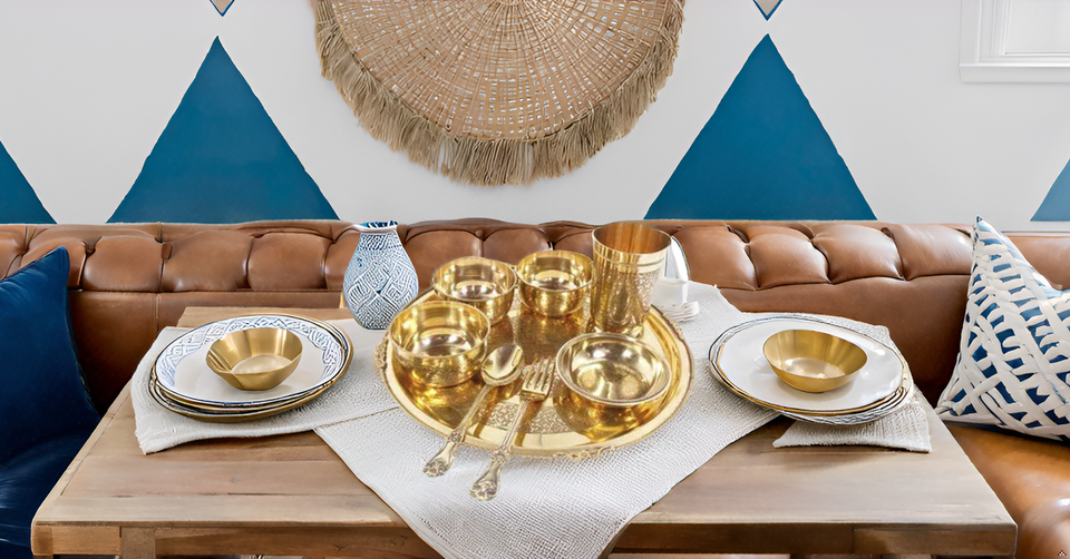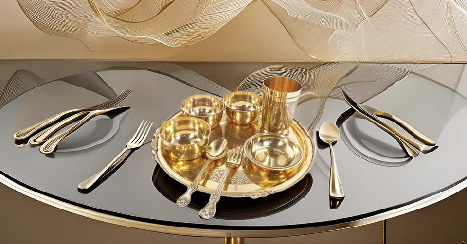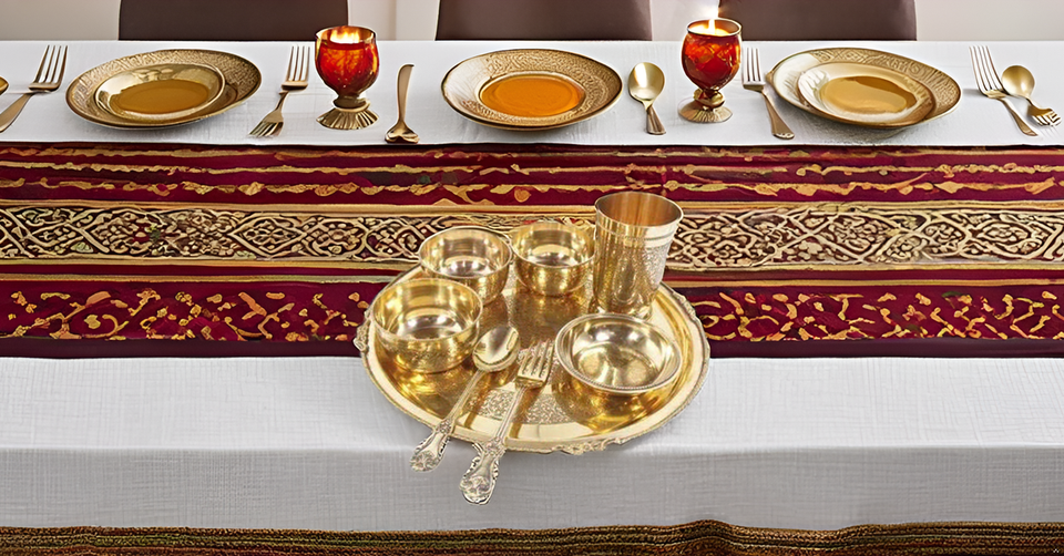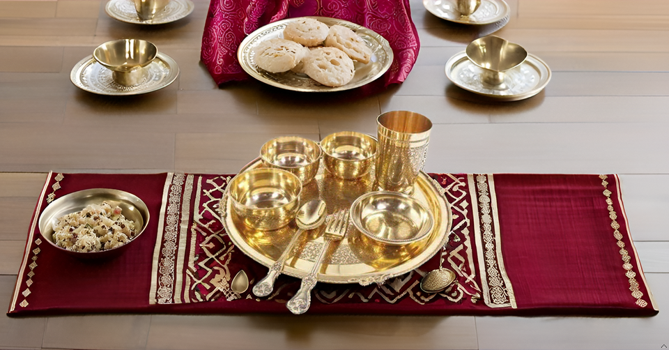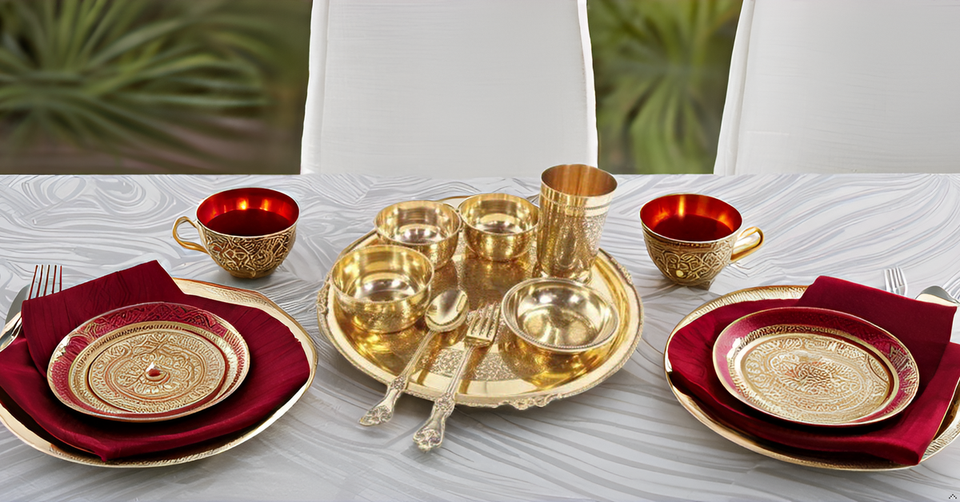 Juego de cena tradicional indio en relieve, cuencos de plato Thali de latón hechos a mano con cuchara de vidrio, hermosa vajilla, regalo para la cena