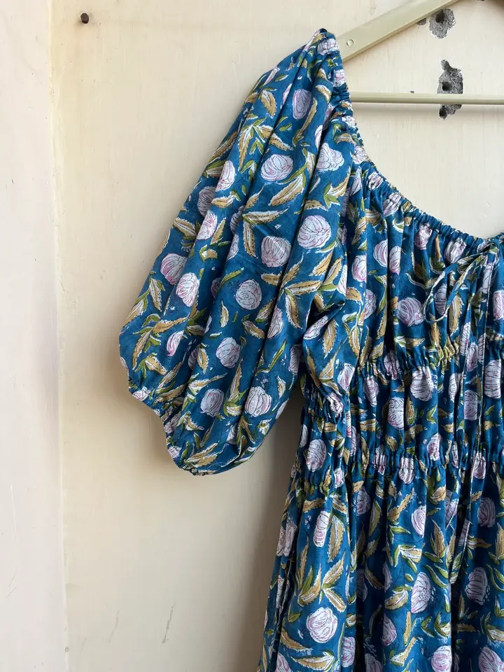 Túnicas indias Vestido de mano Vestido largo de algodón Vestido estampado indio Vestido bohemio azul Colección de estampado de bloque corto