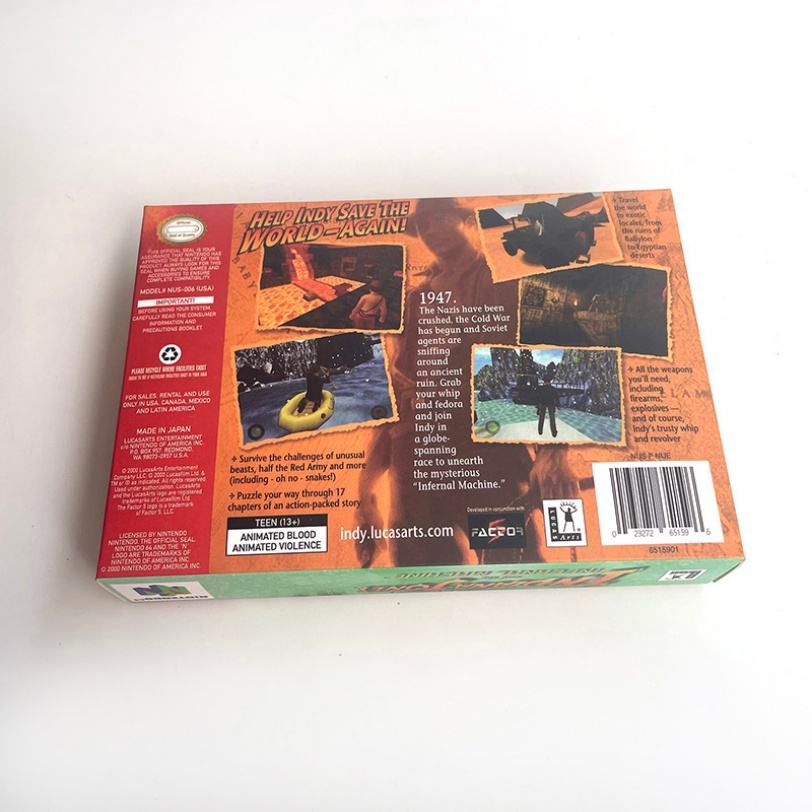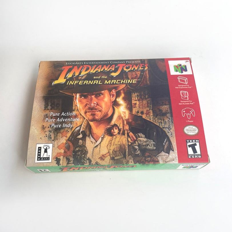 Caja de repuesto para cartucho de juego Indiana Jones and the Infernal Machine de alta calidad, de cartón grueso de 64 bits con bandeja para N64