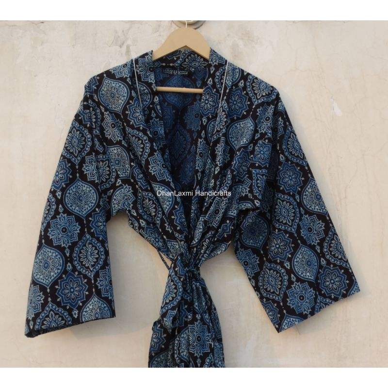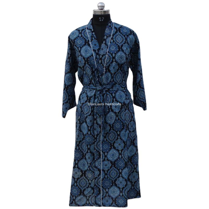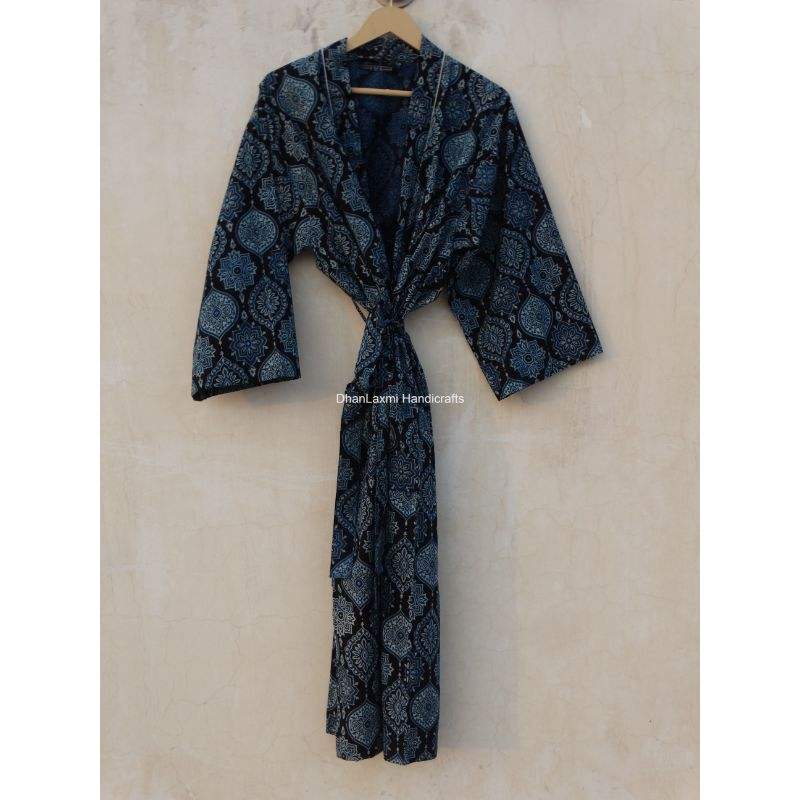 Bata larga de dormir de algodón 100%, Kimono con estampado indio, azul Indigo, para baño, con patrón Floral, venta al por mayor