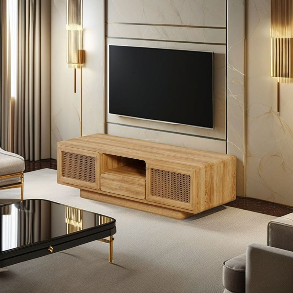 Soporte de TV de madera de teca maciza hecho en Indonesia, diseño minimalista para muebles de apartamento y hotel para muebles de sala de estar