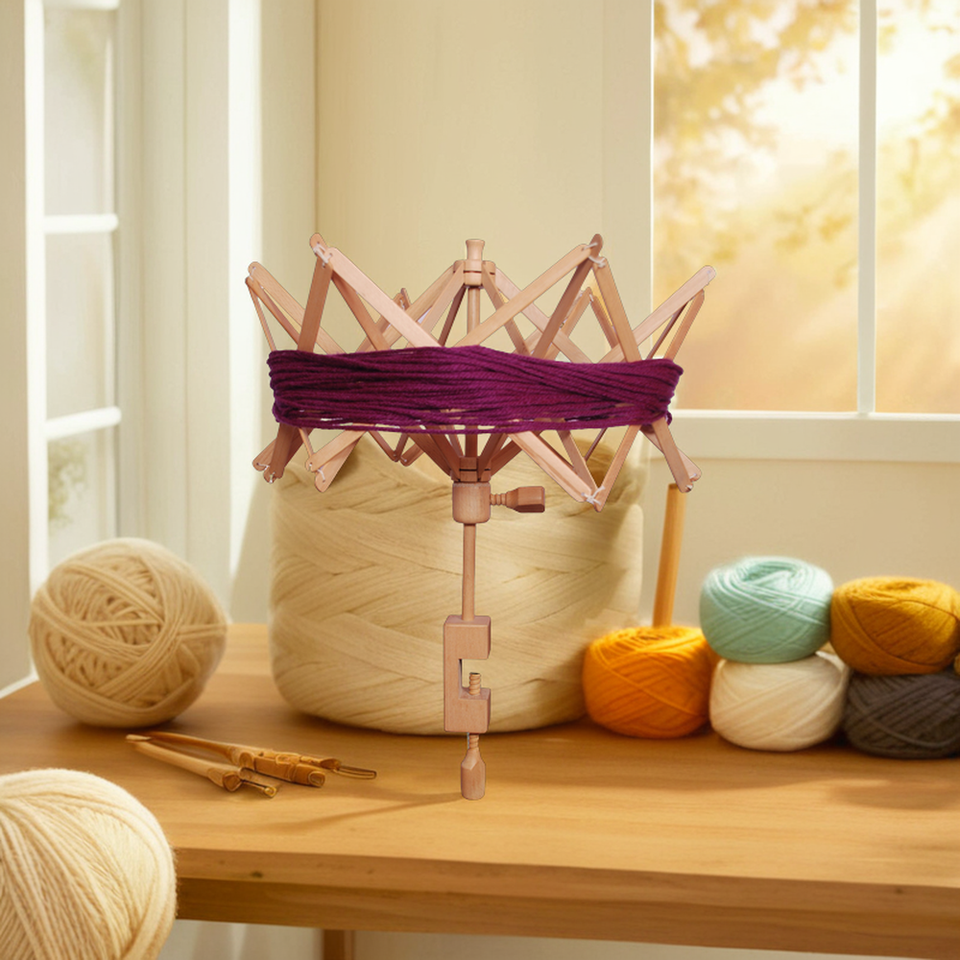 Uso:Sostiene madejas o madejas de hilo en su lugar a medida que los enrolla en bolas.
