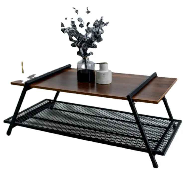 Mesa de Centro Industrial de 2 Niveles con Superficie Rectangular de Madera, Estante de Almacenamiento de Malla y Estructura de Metal Negro para Sala de Estar