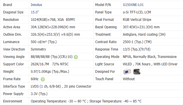Módulo LCD TFT Innolux G150XNE-L01 de 15 Pulgadas con Alto Contraste 2500:1, Interfaz LVDS para Control Industrial, Precio de Fábrica