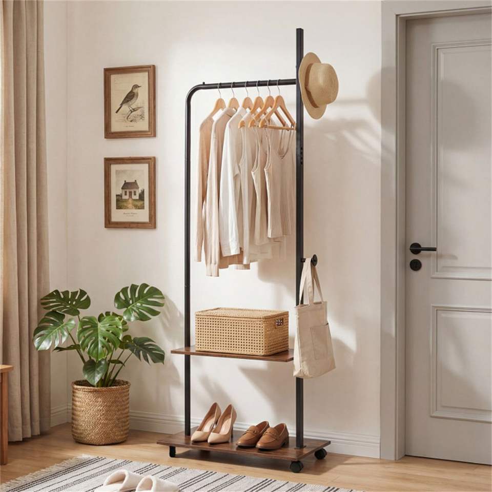 Perchero Industrial Independiente con 2 Estantes de Madera y Ganchos, Perchero con Ruedas para Dormitorio y Entrada, Percheros y Rieles para Ropa