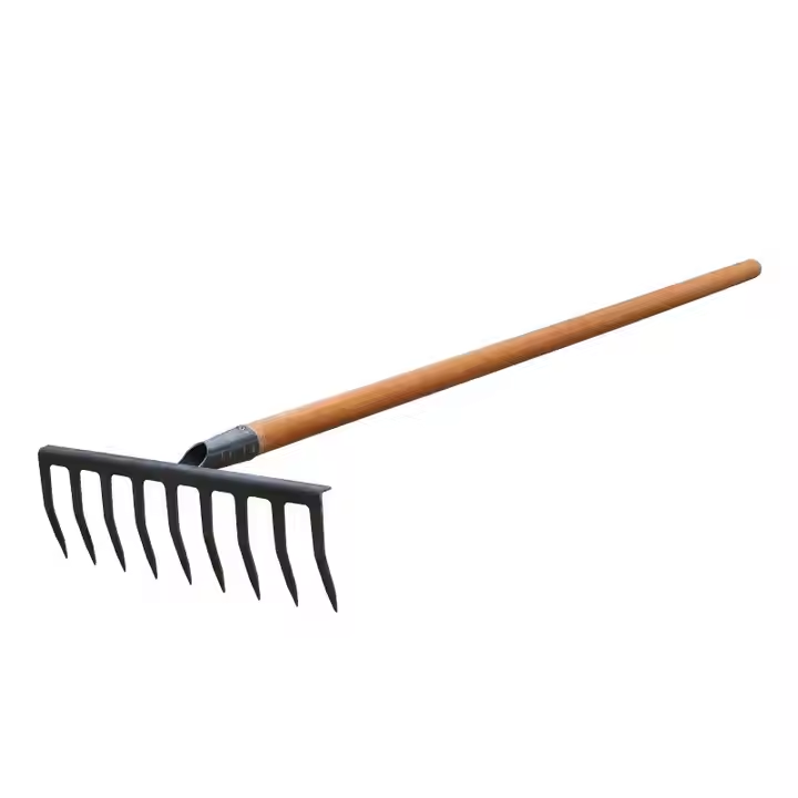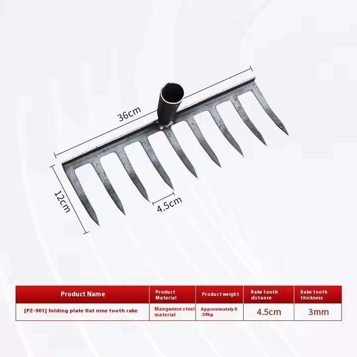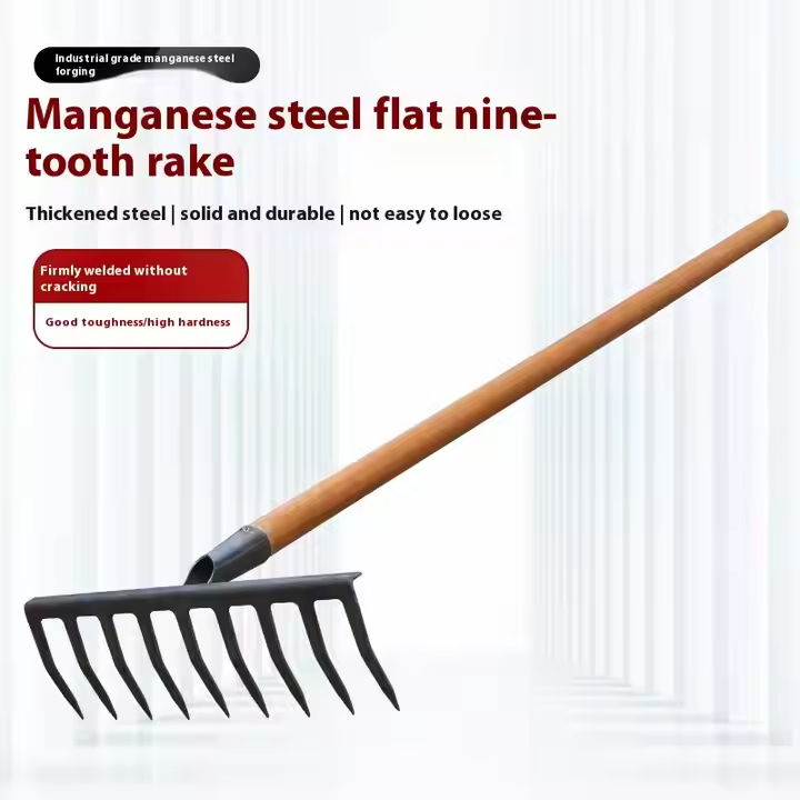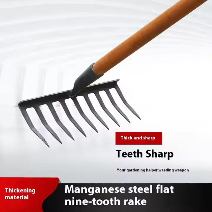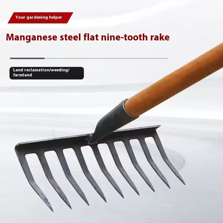 Rastrillo de acero al manganeso de grado industrial Grada de clavos de 9 dientes Mango largo Grada agrícola y de jardín Multifuncional