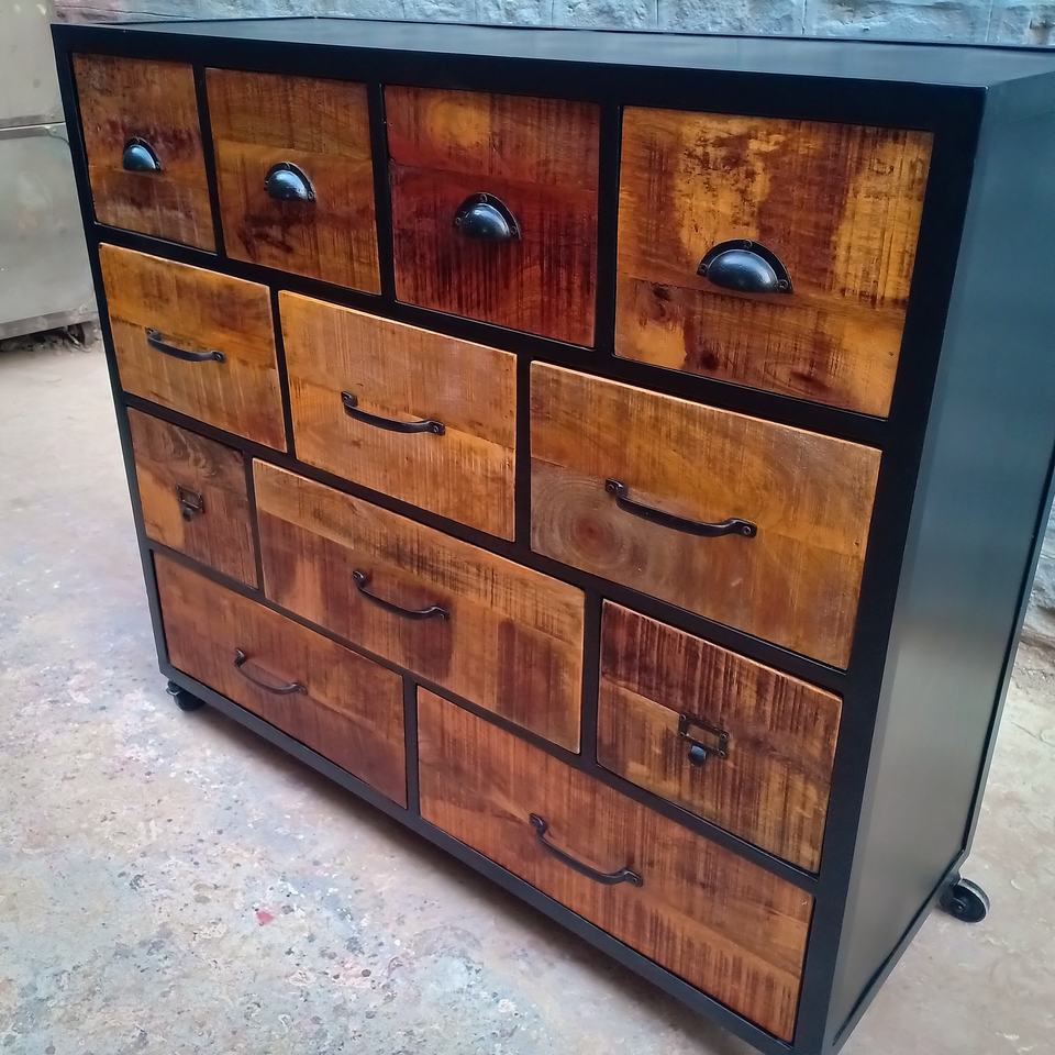 Industrial cumple con mediados de siglo moderno Retro antiguo de madera maciza hierro gabardina pecho cajones gabinete muebles de sala de estar
