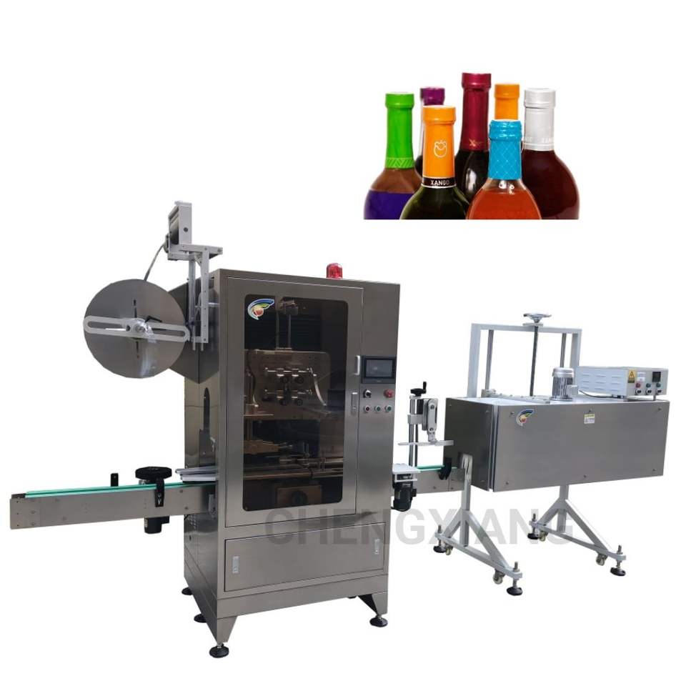 Equipo industrial automático para etiquetado y termocontracción de mangas para cuellos de botellas de vidrio redondas y envases planos de PET