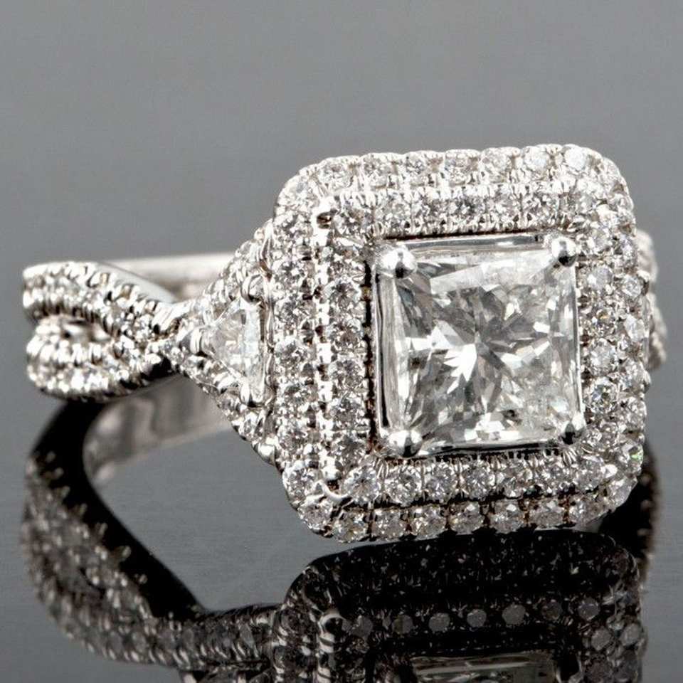Infinity 2,26 Ct Princess Cut Trillion Cut Diamonds Sides Double Halo Diamond Twisted Shank Anillo de compromiso 18K Oro blanco