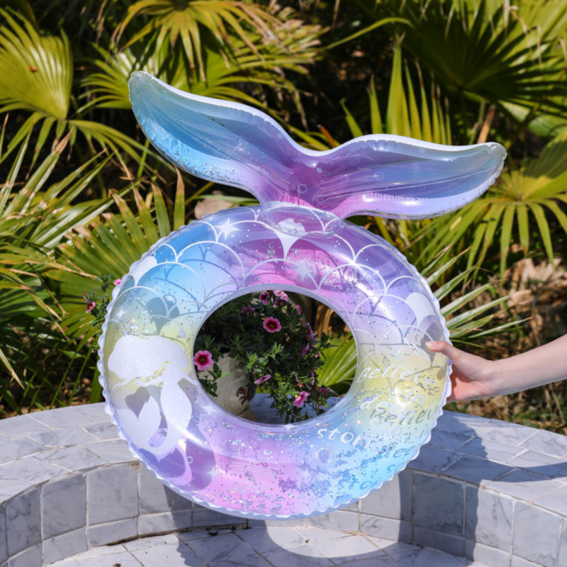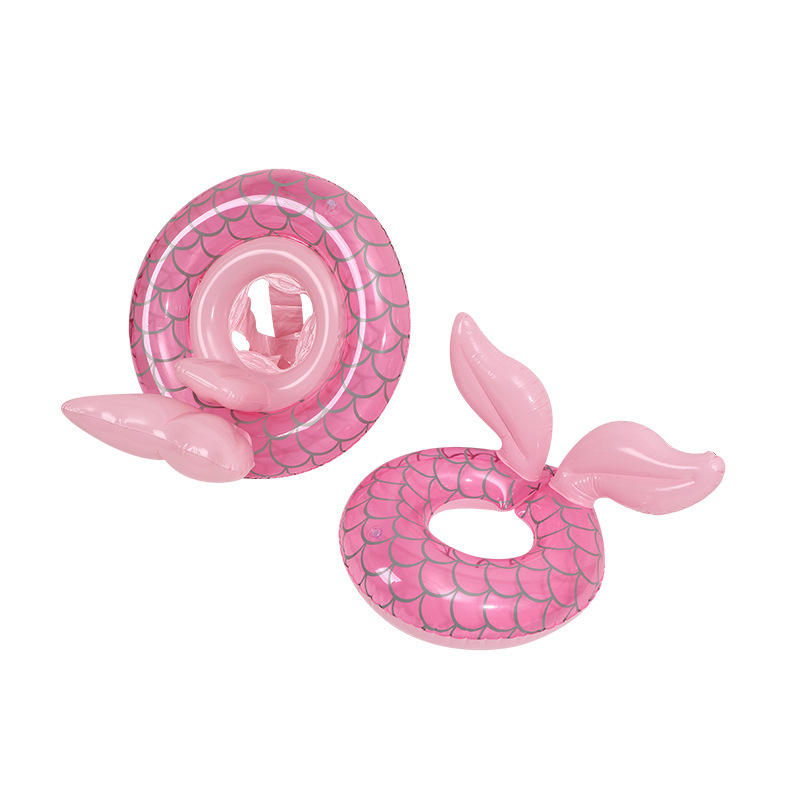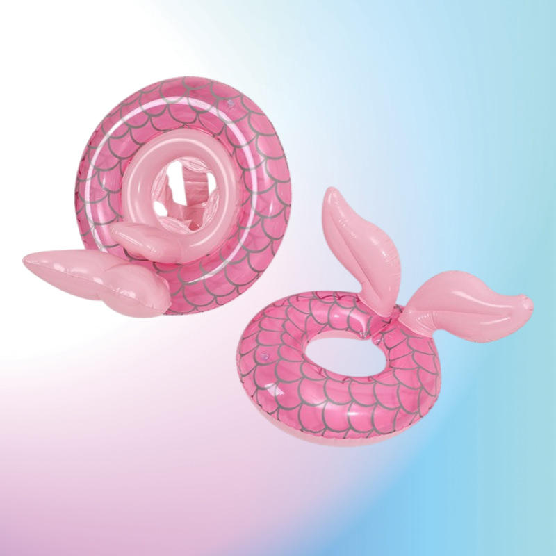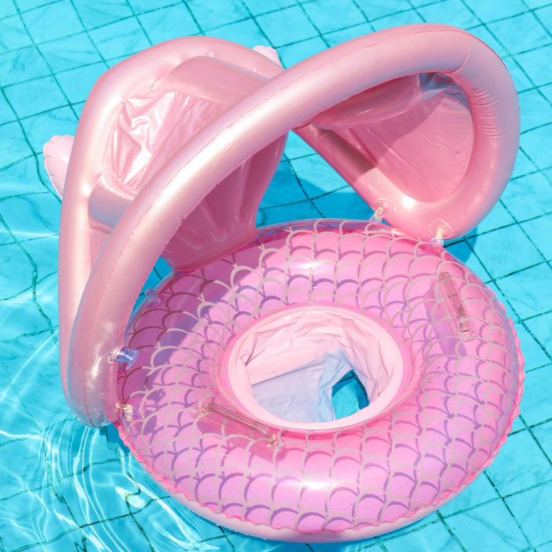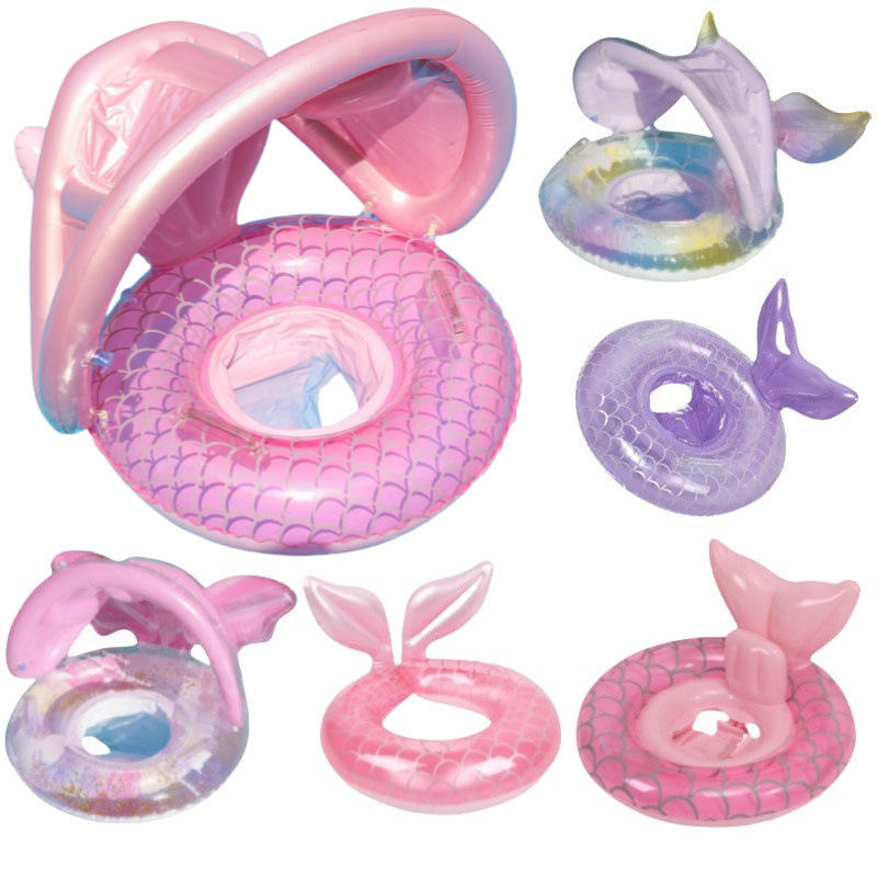 Flotador inflable de sirena con diseño de cola de pez y toldo para niños, dispositivo de flotación para juegos acuáticos.