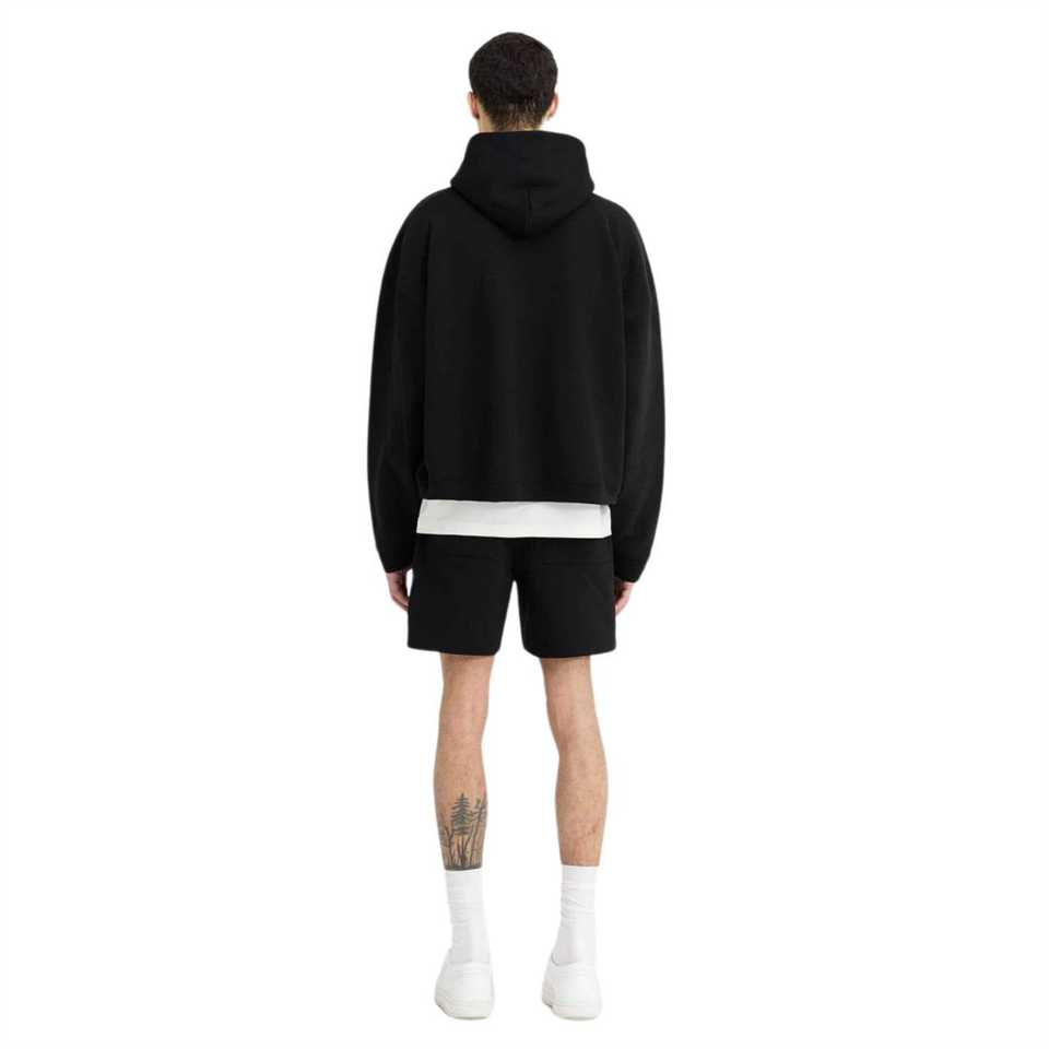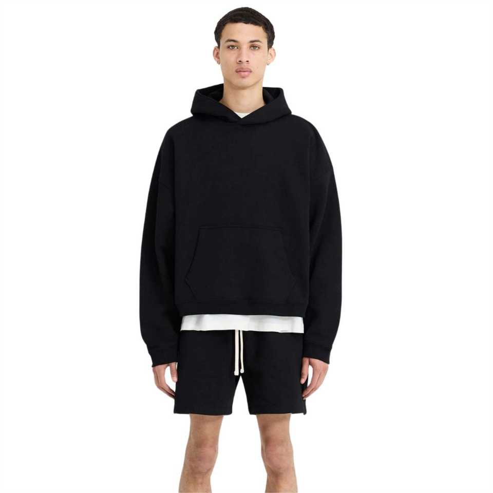 Inicial Boxy Pullover Sudadera con capucha Negro Peso pesado Algodón 500gsm Streetwear Mangas anchas Cuerpo recortado Marca mínima