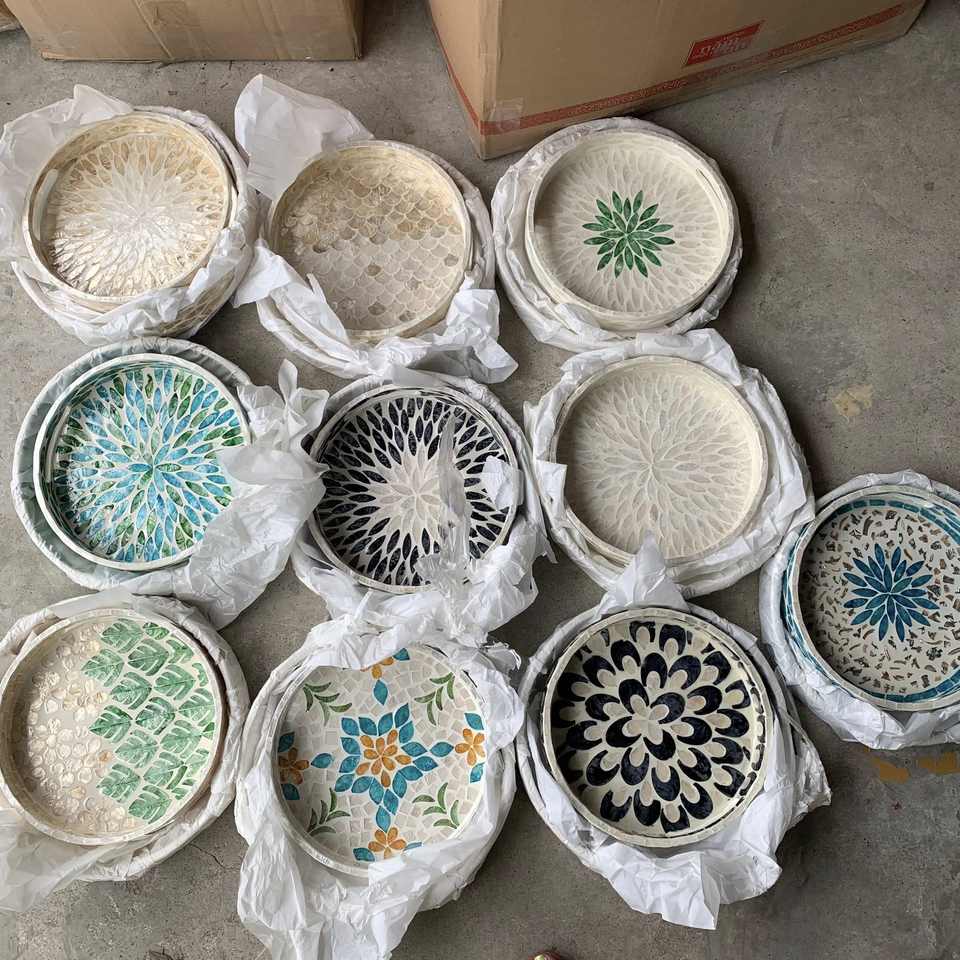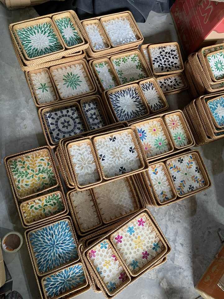 Bandeja de Ratán con Incrustaciones de Conchas, Estilo Vintage, Bandeja de Ratán con Mosaico de Conchas, Bandeja Cuadrada de Ratán con Conchas, Bandeja de Ratán Tejida a Mano