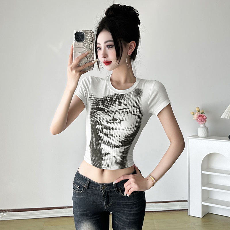 Camiseta de Manga Corta con Estampado Gráfico de Gato Estilo Americano para Mujer, Corte Ajustado, Top Corto, Sexy, Moda Urbana, Atuendo de Verano