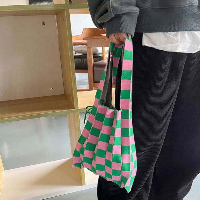 Bolso de Hombro Tejido de Lana con Diseño Plegable Estilo Ins y Colores en Contraste, Bolso de Compras Organizado
