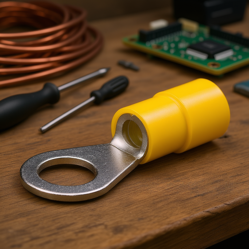 Terminal de ojal aislado tipo anillo amarillo para cableado eléctrico