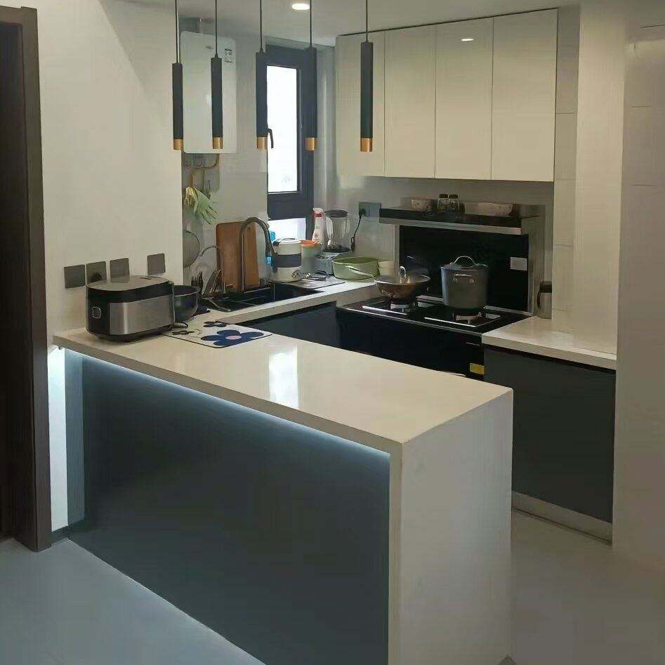 Mesa de Cocina Integrada con Isla de Madera y Fregadero, con Mesa de Comedor Suspendida y Barra